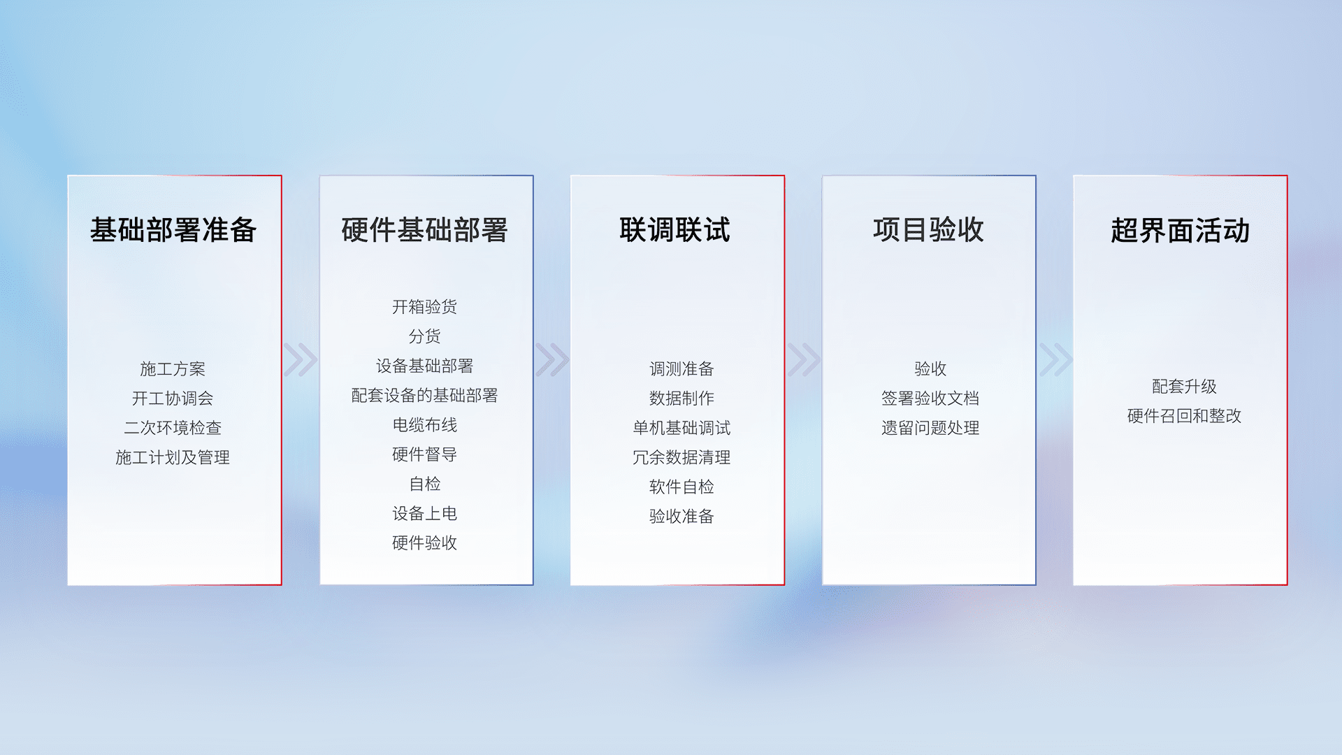 从基础部署准备、、硬件基础部署、、联调联试、、项目验收、、、、越界面活动的全过程可追溯,,保证施工质量和进度。。